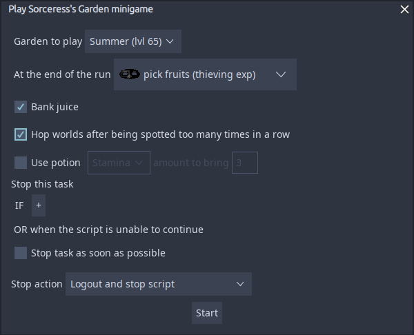 Though one huge perk is that you can add more conditionals in; for example, if you know you need to do 3,000 runs to get enough glasses of Sq'irk juice, you can set this up super easily, which coincides with a pain-free user experience that everyone can enjoy. It is also worth mentioning there are other conditionals too, such as stopping after X time has run.